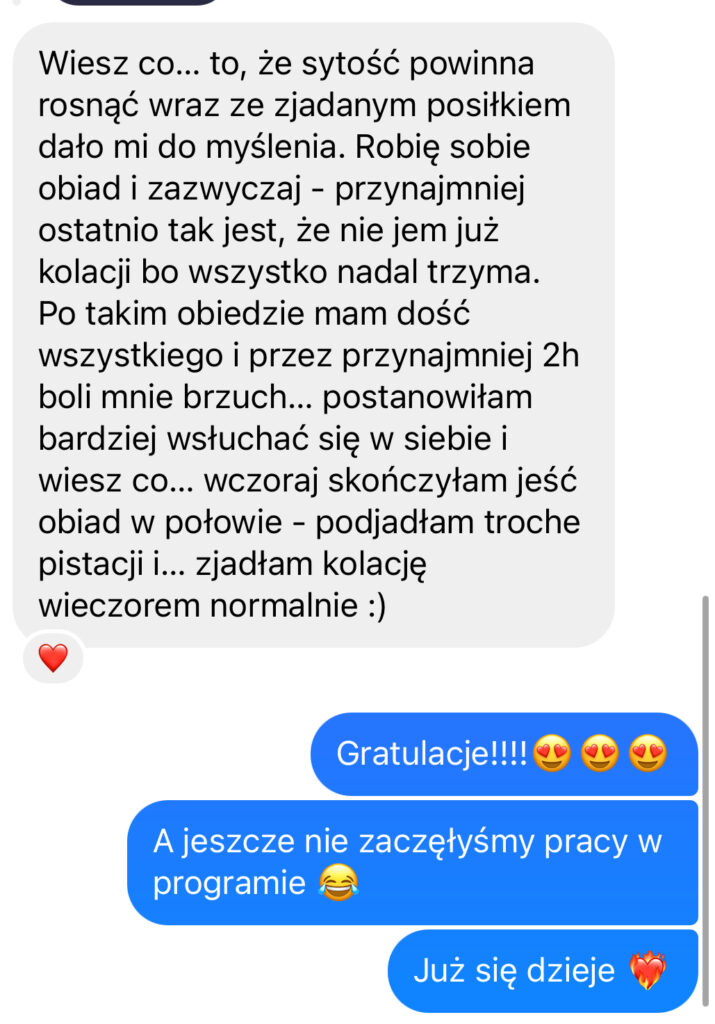 Jesz regularnie, czujesz się świetnie po posiłkach, masz kontrolę nad tym co, kiedy i w jakich ilościach zjadasz, a ewentualne problemy są w Twoim odczuciu związane z emocjami, myślami itp.